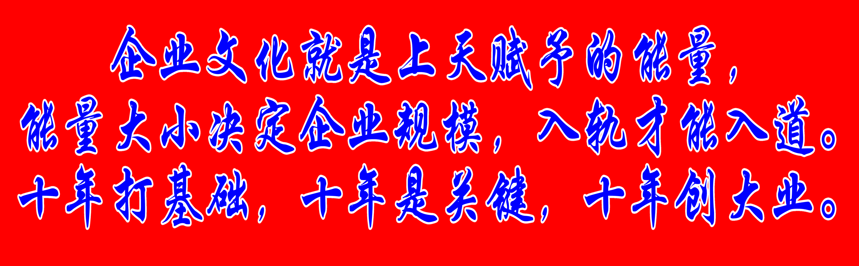 企業(yè)文化就是上天賦予的能量,能量大小決定企業(yè)規(guī)模,入軌才能入道。十年打基礎(chǔ),十年是關(guān)鍵,十年創(chuàng)大業(yè)。