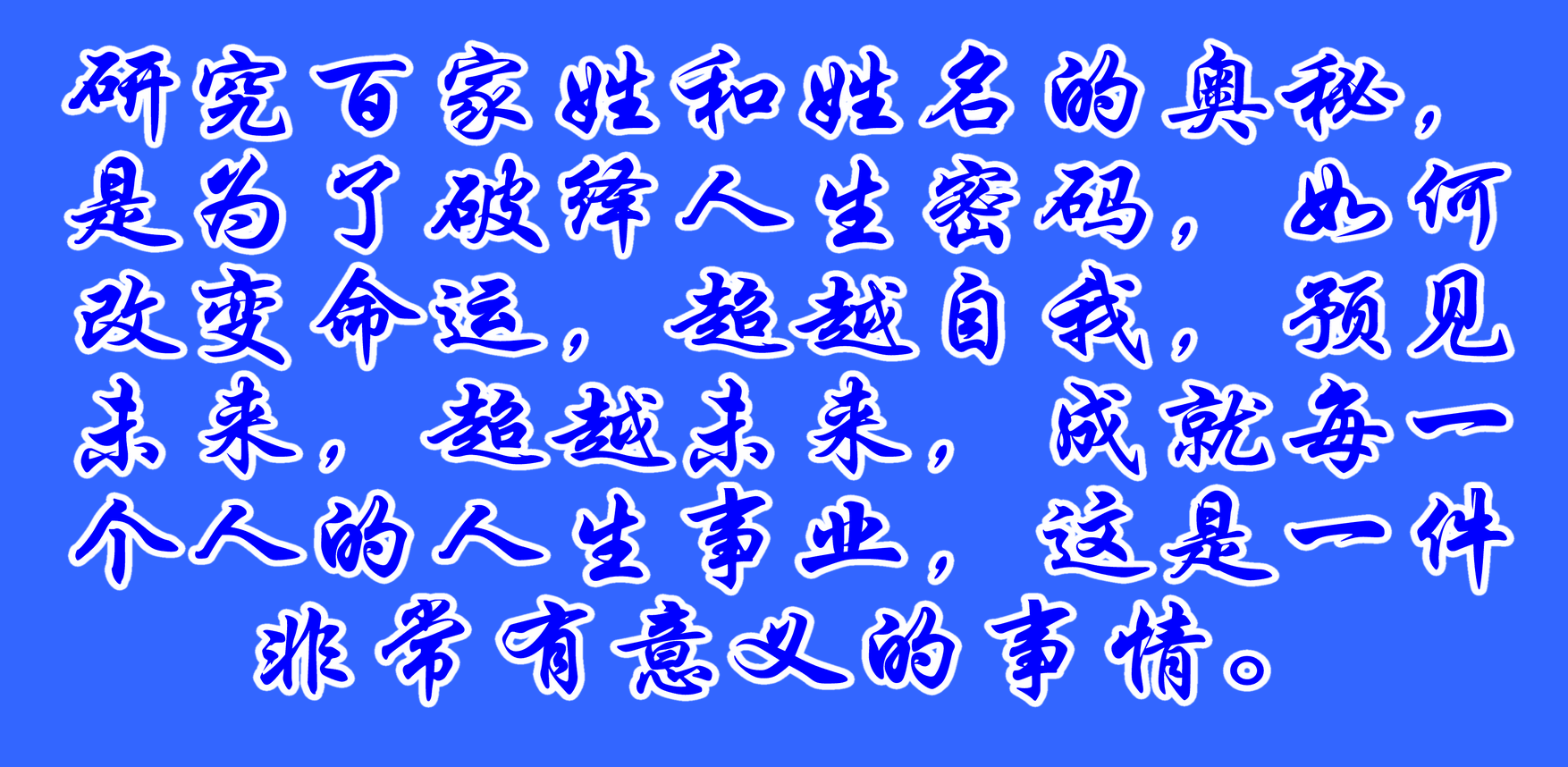 我研究百家姓和姓名的奧秘,是為了破譯人生密碼,如何改變命運,超越自我,預見未來,超越未來,成就每一個人的人生事業,這是一件非常有意義的事情。