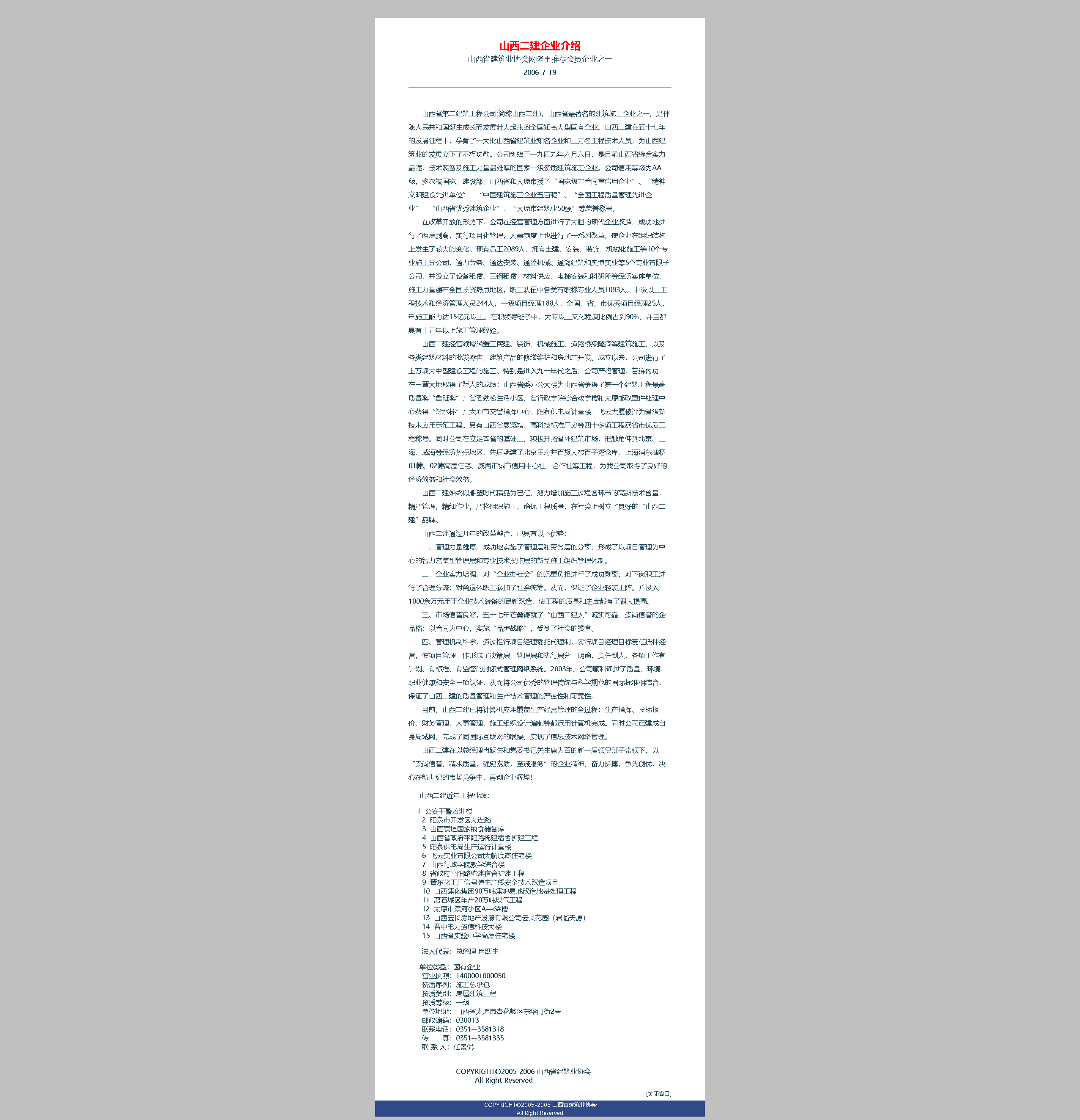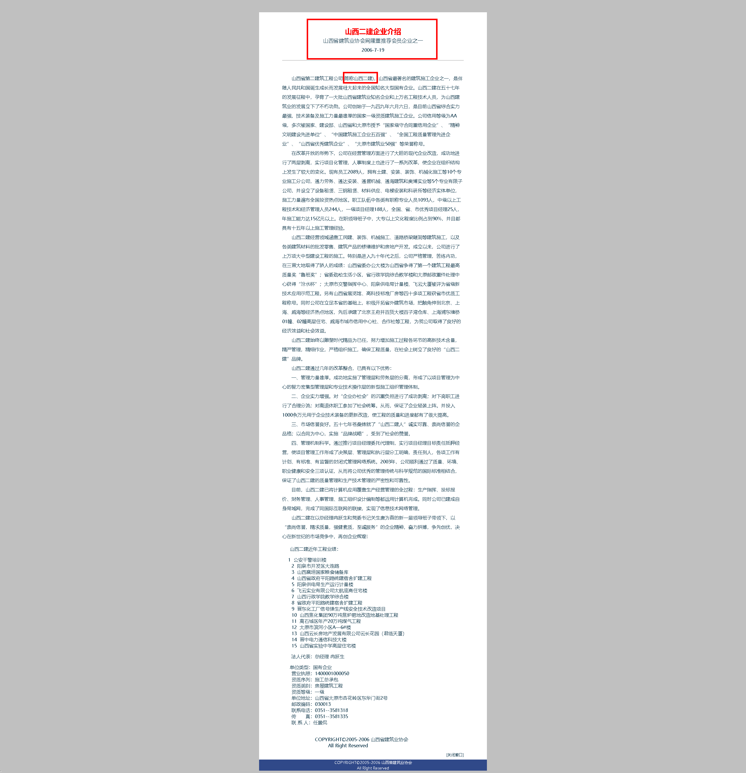你看看我是如何推薦我的母企的,是協(xié)會(huì)作為宣傳會(huì)員企業(yè)的第一家,尤其是我劃了紅框的“山西二建”,更是歷史上第一次這么稱呼,十年后2016年1月5日的山西二建集團(tuán)有限公司揭牌儀式,正是那時(shí)候就開(kāi)始謀劃的!