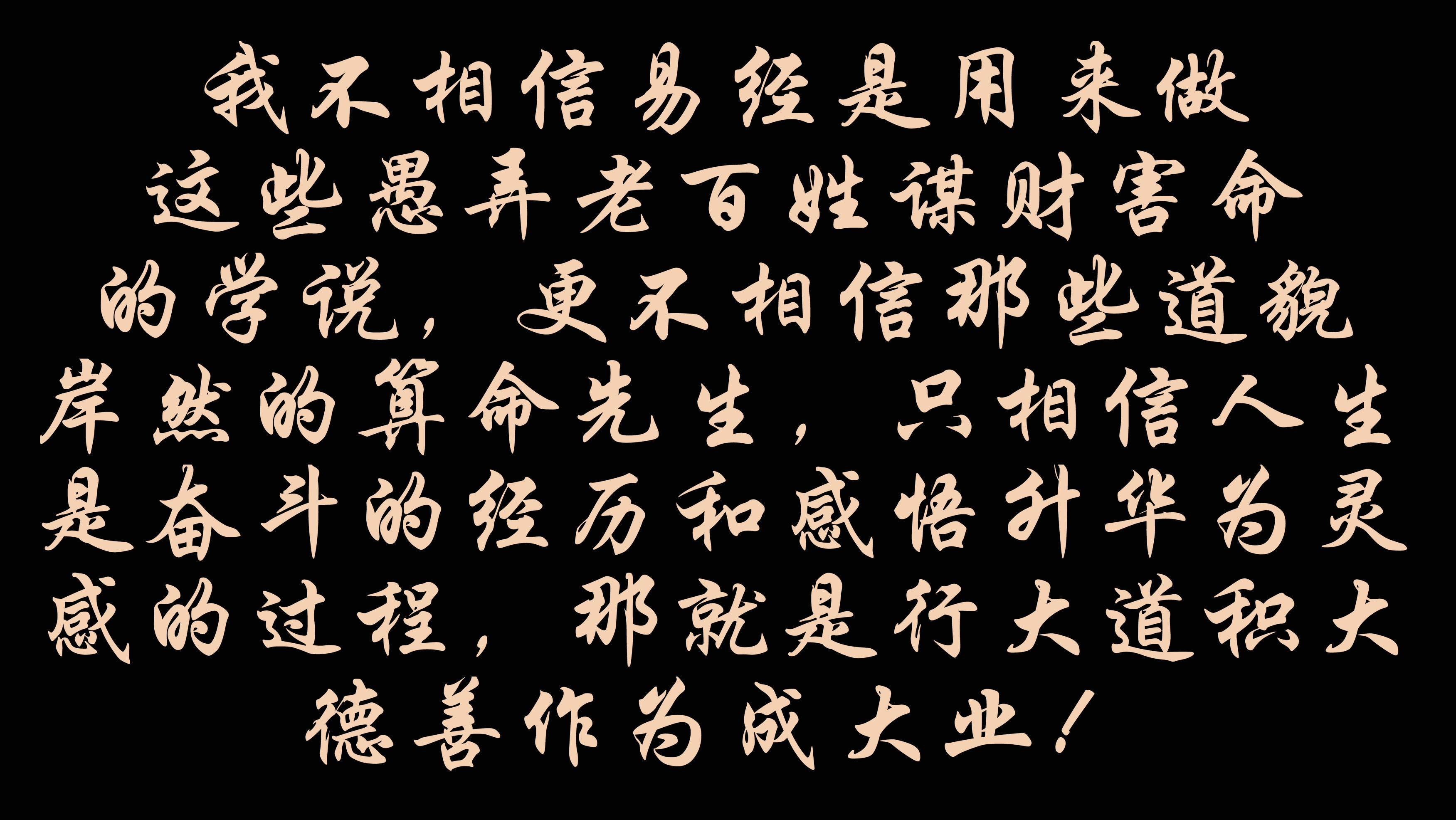 我不相信易經(jīng)是用來做這些愚弄老百姓謀財(cái)害命的學(xué)說,更不相信那些道貌岸然的算命先生,只相信人生是奮斗的經(jīng)歷和感悟升華為靈感的過程,那就是行大道積大德善作為成大業(yè)!