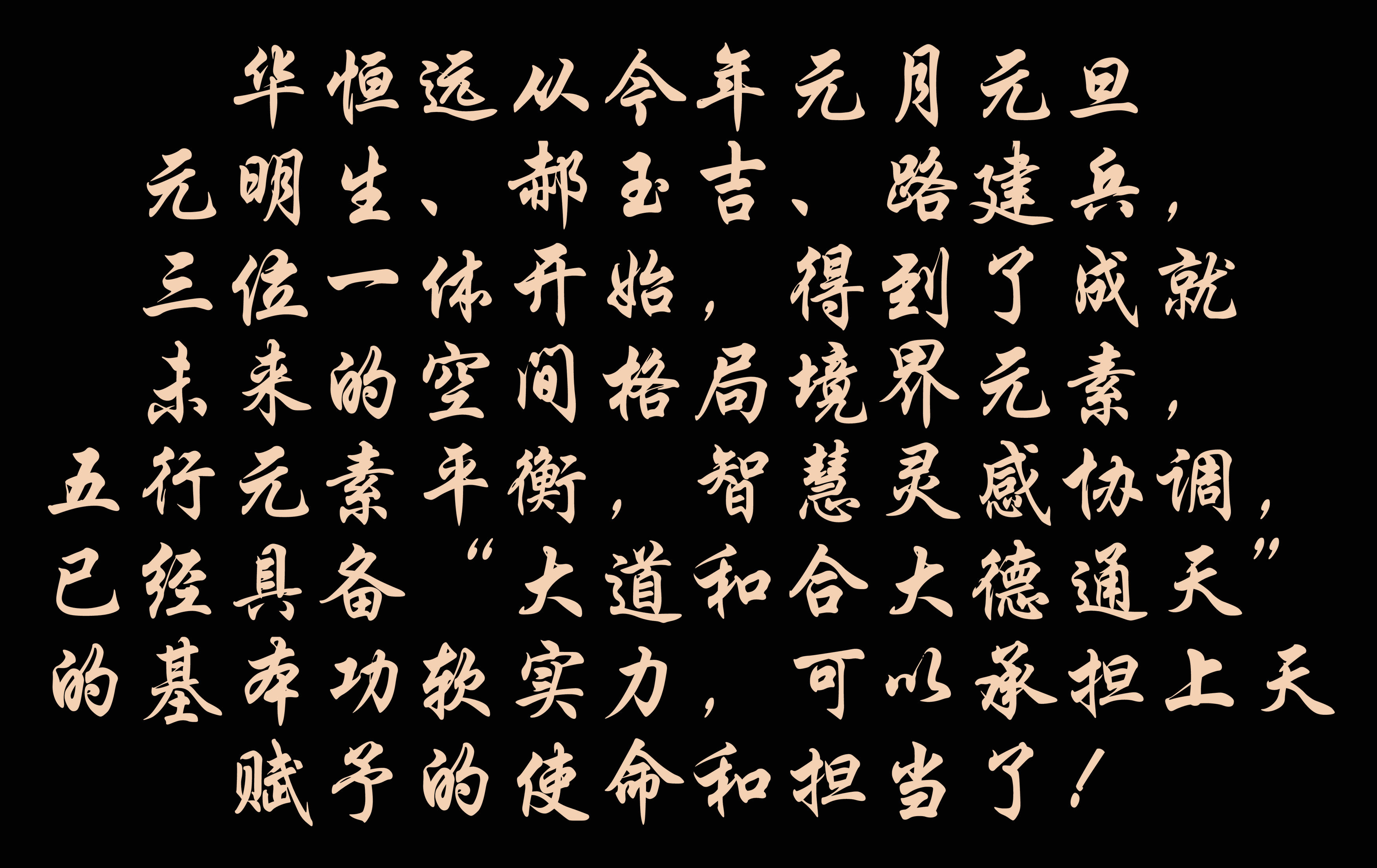 華恒遠(yuǎn)從今年元月元旦元明生、郝玉吉、路建兵,三位一體開(kāi)始,得到了成就未來(lái)的空間格局境界元素,五行元素平衡,智慧靈感協(xié)調(diào),已經(jīng)具備“大道和合大德通天”的基本功軟實(shí)力,可以承擔(dān)上天賦予的使命和擔(dān)當(dāng)了!