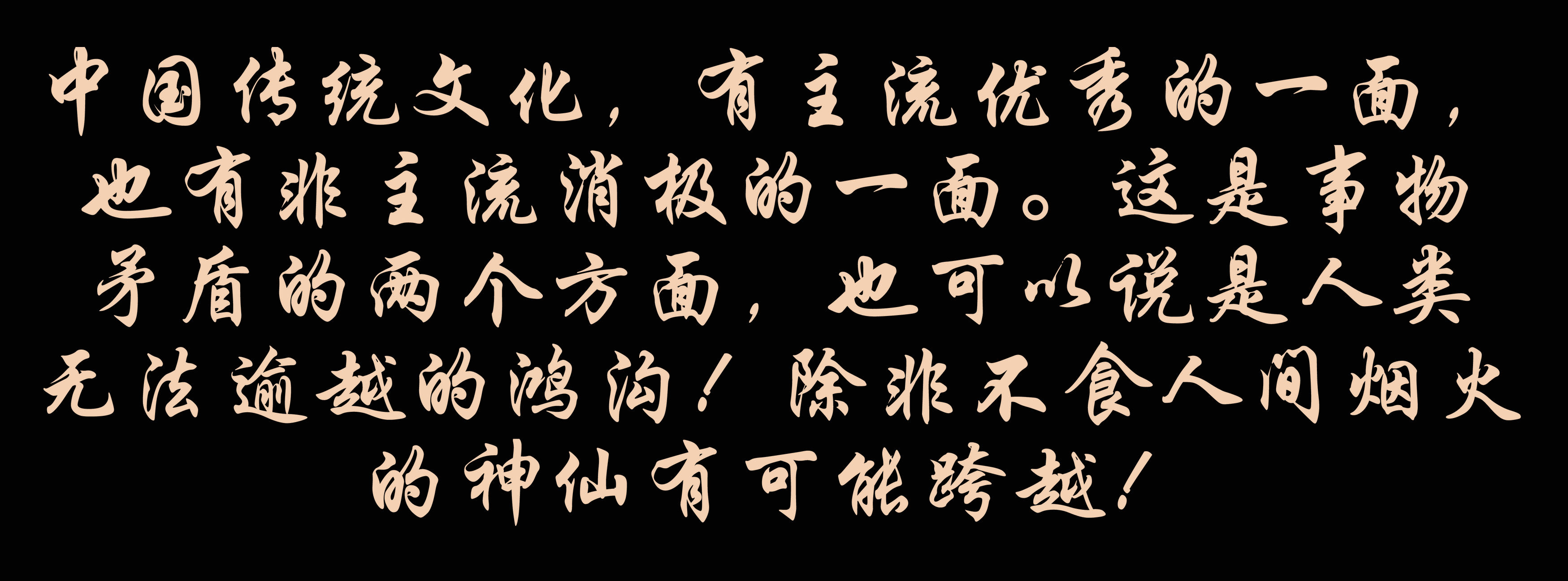 中國傳統(tǒng)文化,有主流優(yōu)秀的一面,也有非主流消極的一面。這是事物矛盾的兩個方面,也可以說是人類無法逾越的鴻溝!除非不食人間煙火的神仙有可能跨越!