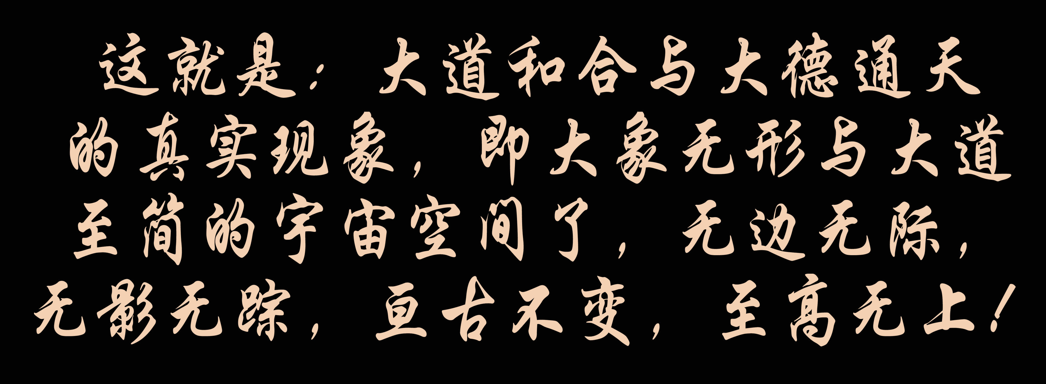 這就是:大道和合與大德通天的真實現象,即大象無形與大道至簡的宇宙空間了,無邊無際,無影無蹤,亙古不變,至高無上!
