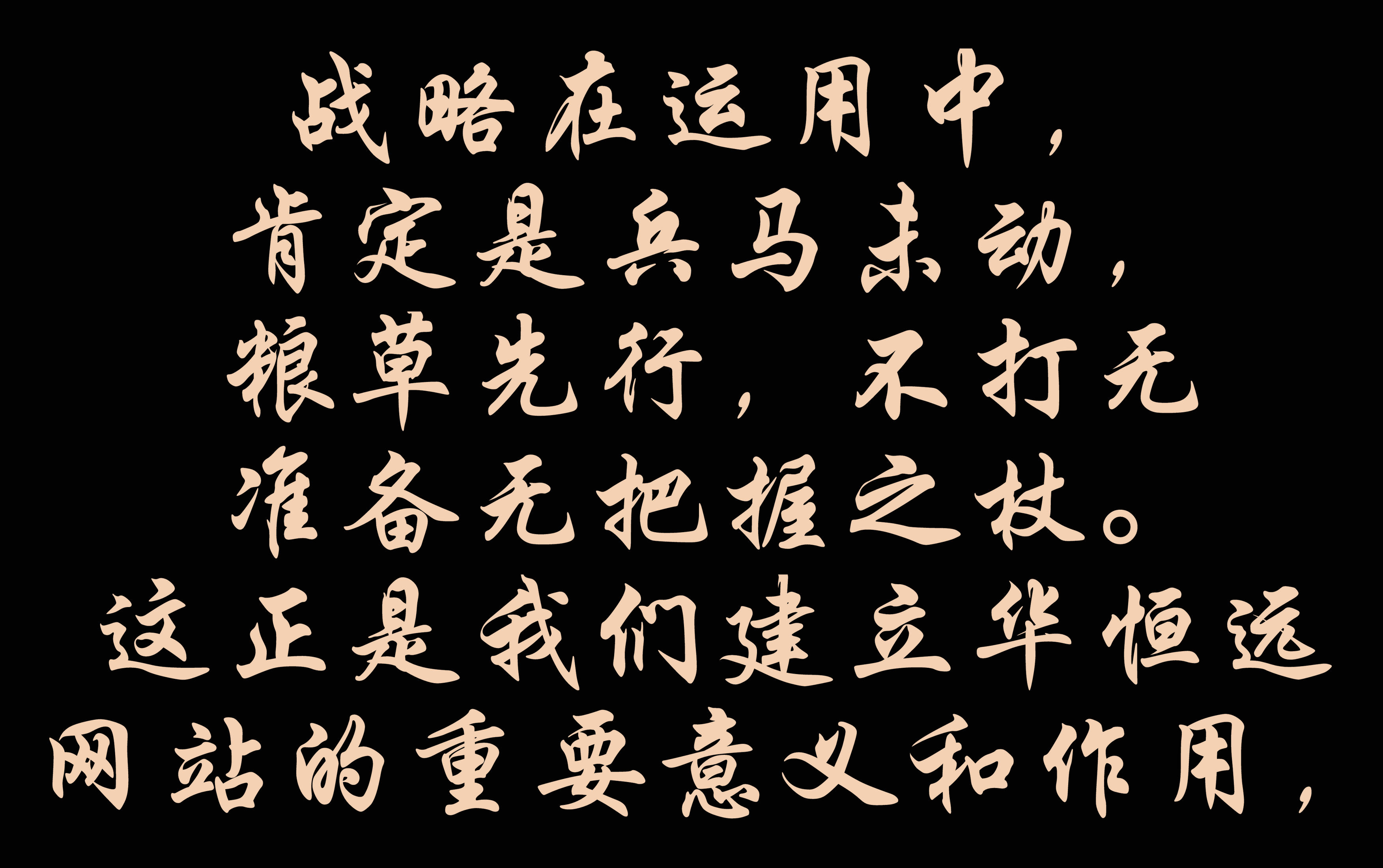 戰(zhàn)略在運(yùn)用中,肯定是兵馬未動(dòng),糧草先行,不打無(wú)準(zhǔn)備無(wú)把握之杖。這正是我們建立華恒遠(yuǎn)網(wǎng)站的重要意義和作用,讓更多層面更多層次的瀏覽者,知道華恒遠(yuǎn),喜歡華恒遠(yuǎn),就已經(jīng)達(dá)到了戰(zhàn)略發(fā)展的第一步,那么第二步就好邁開了!三年時(shí)間,人們自然而然接受華恒遠(yuǎn),你們可是要出大名的,那個(gè)時(shí)候,才會(huì)真正懂得什么是戰(zhàn)略,才會(huì)自覺自愿加入到開發(fā)網(wǎng)站的行動(dòng)之中,那就到了網(wǎng)站改版的必須空間了!