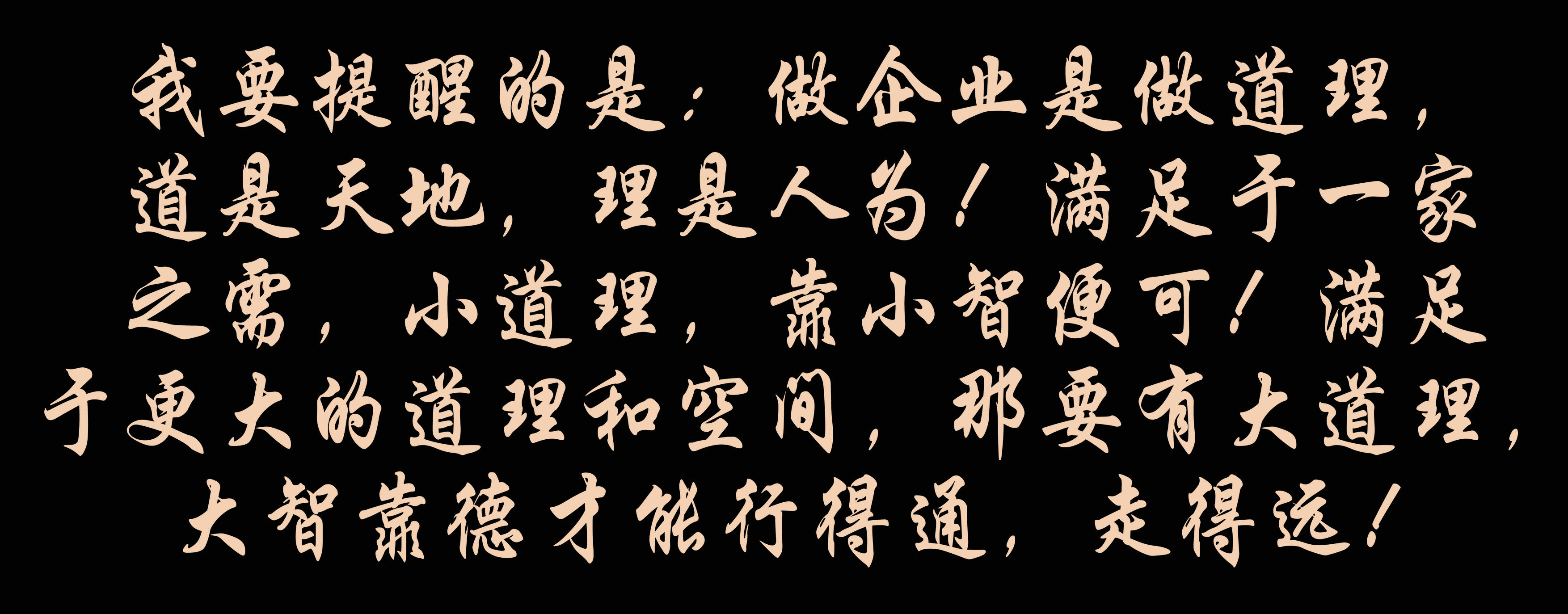 我要提醒的是:做企業是做道理,道是天地,理是人為!滿足于一家之需,小道理,靠小智便可!滿足于更大的道理和空間,那要有大道理,大智靠德才能行得通,走得遠!