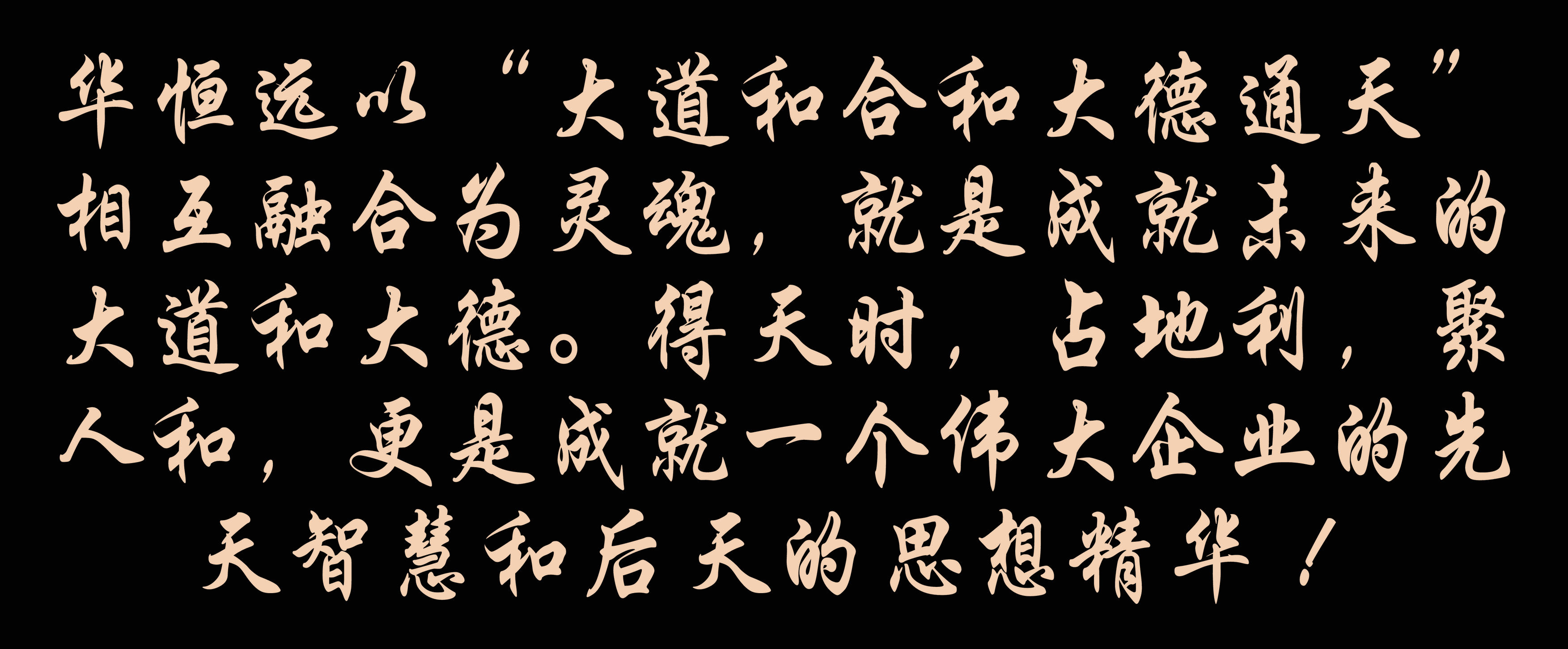 華恒遠以“大道和合和大德通天”相互融合為靈魂,就是成就未來的大道和大德。得天時,占地利,聚人和,更是成就一個偉大企業的先天智慧和后天的思想精華 !
