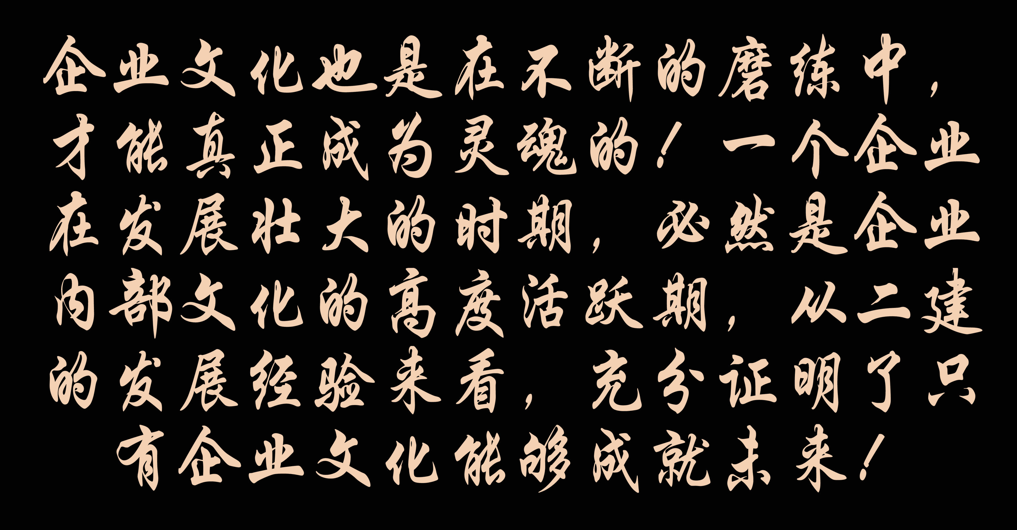 企業(yè)文化也是在不斷的磨練中,才能真正成為靈魂的!一個企業(yè)在發(fā)展壯大的時期,必然是企業(yè)內(nèi)部文化的高度活躍期,從二建的發(fā)展經(jīng)驗(yàn)來看,充分證明了只有企業(yè)文化能夠成就未來!