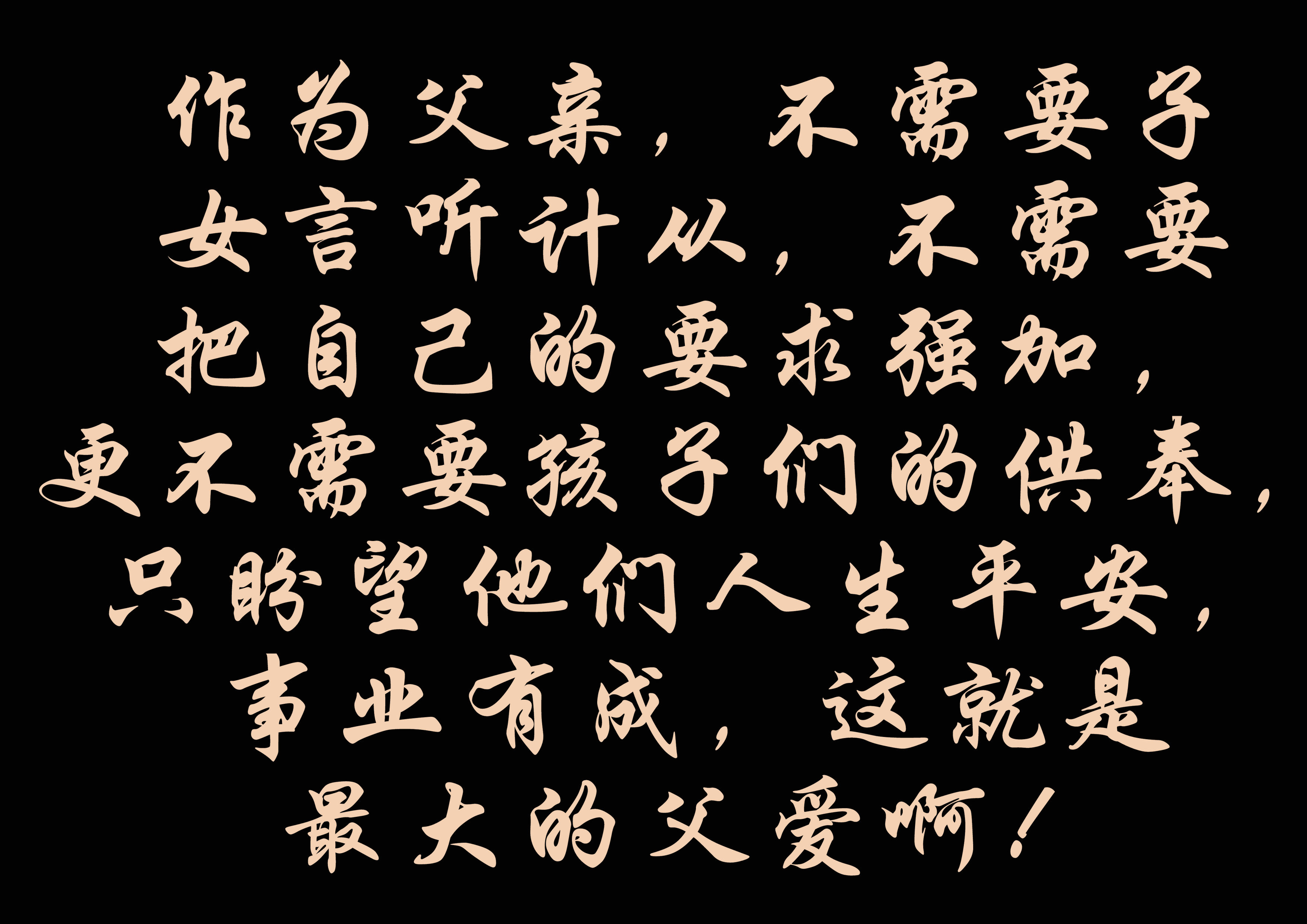 父子之間,需要互相關(guān)心,需要互相理解,更需要實實在在的付出!作為父親,不需要子女言聽計從,不需要把自己的要求強加,更不需要孩子們的供奉,只盼望他們?nèi)松桨?,事業(yè)有成,這就是最大的父愛?。?/span>