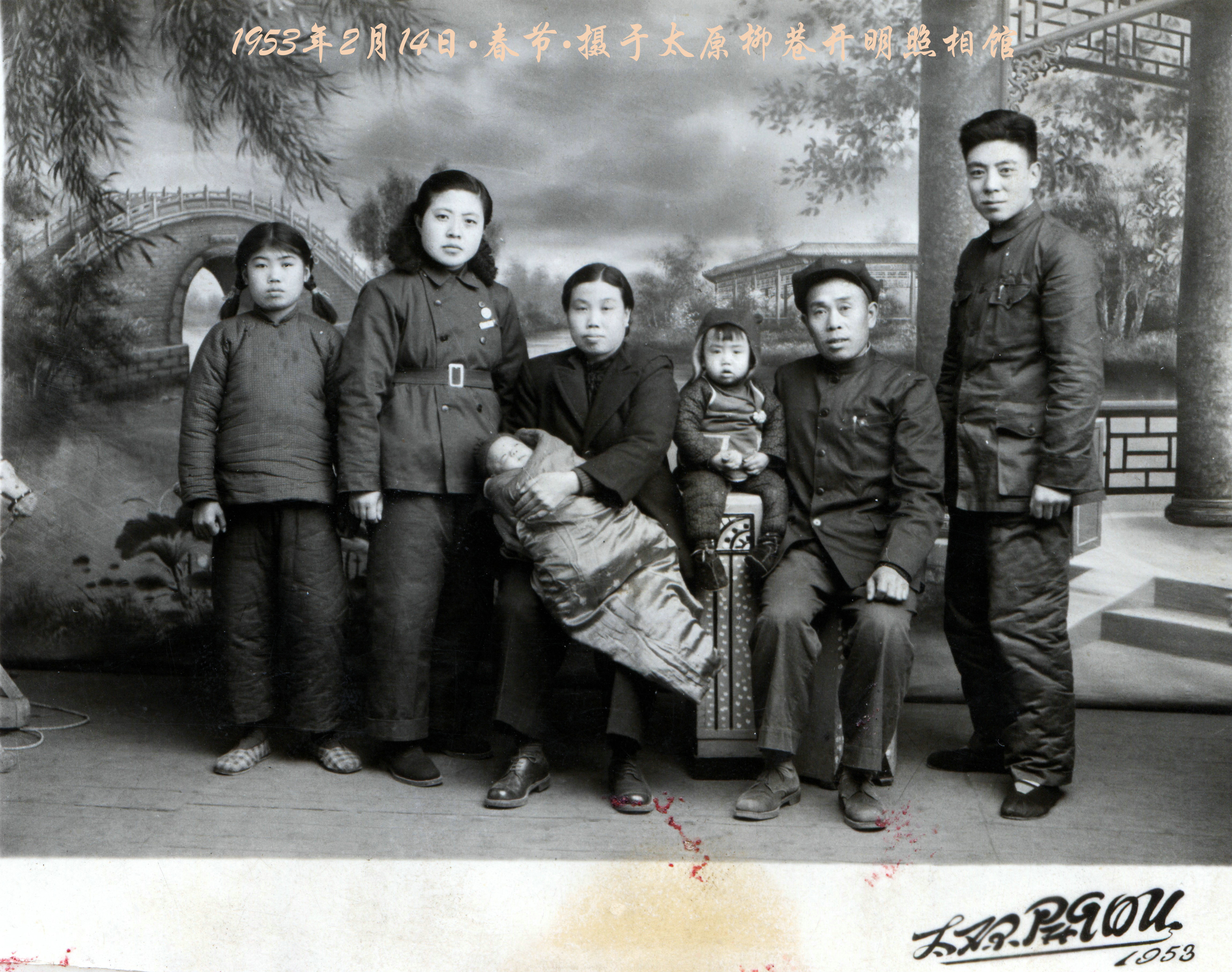 下面這張照片是1953年大年初一的照像,那個時代過年第一件大事,是留給后代的禮物——全家福!虧了這張照片,我才知道,那是我來到人間第54天的第一次照相!