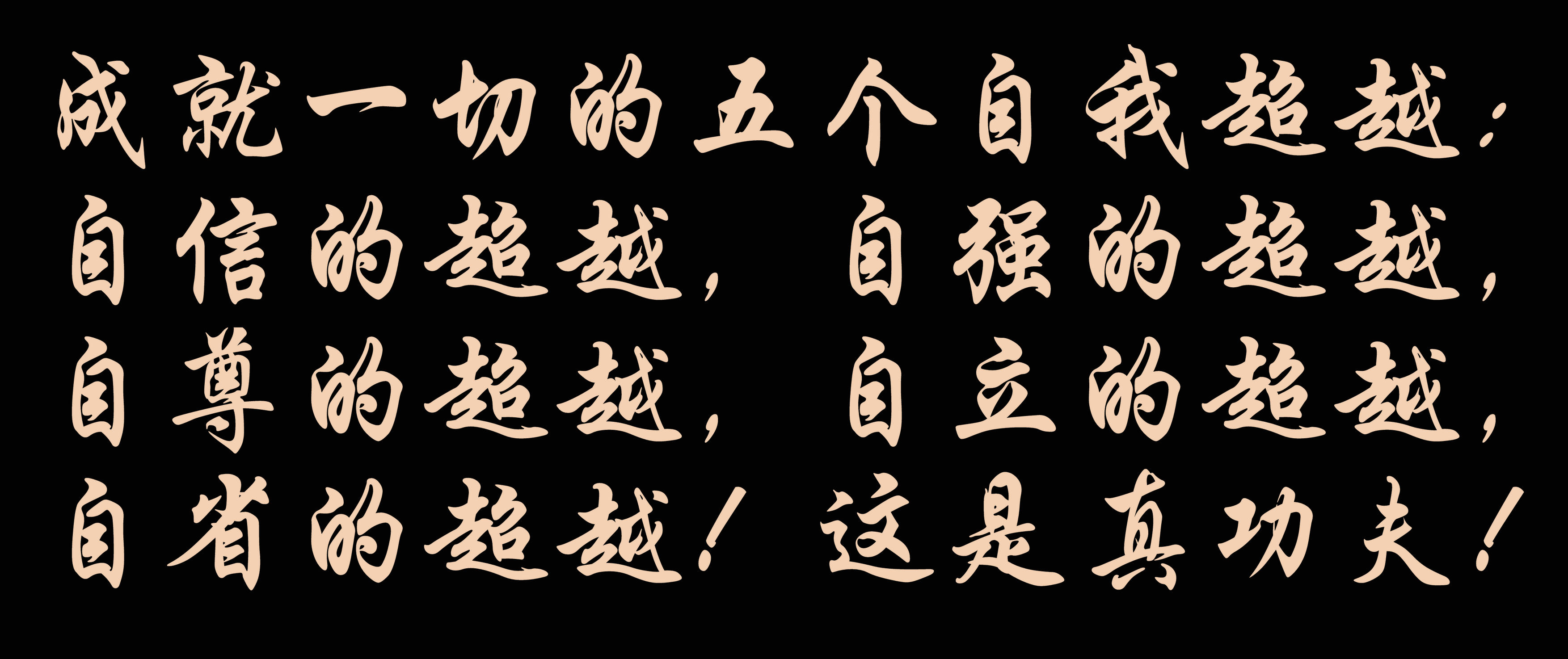 真功夫,硬功夫,在修煉,在修心,在“五不怕”,在“五不粘”!真正做到這些,就有了成就一切的五個自我超越:自信的超越,自強的超越,自尊的超越,自立的超越,自省的超越!這是真功夫!
