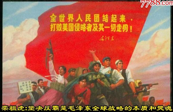 “社會(huì)主義陣營(yíng)各國(guó)人民要聯(lián)合起來(lái),亞洲、非洲、拉丁美洲各國(guó)人民要聯(lián)合起來(lái),全世界各大洲的人民要聯(lián)合起來(lái),所有愛(ài)好和平的國(guó)家要聯(lián)合起來(lái),所有受到美國(guó)侵略、控制、干涉和欺負(fù)的國(guó)家要聯(lián)合起來(lái),結(jié)成最廣泛的統(tǒng)一戰(zhàn)線,反對(duì)美帝國(guó)主義的侵略政策和戰(zhàn)爭(zhēng)政策,保衛(wèi)世界和平。”“美帝國(guó)主義到處橫行霸道,把它自己放在同全世界人民為敵的地位,使它自己越來(lái)越陷于孤立。美帝國(guó)主義手里的原子彈、氫彈,是嚇不倒一切不愿意做奴隸的人們的。全世界人民反對(duì)美國(guó)侵略者的怒潮是不可阻擋的。全世界人民反對(duì)美帝國(guó)主義及其走狗的斗爭(zhēng)一定會(huì)取得更加偉大的勝利。”(毛澤東《中國(guó)人民堅(jiān)決支持巴拿馬人民的愛(ài)國(guó)正義斗爭(zhēng)》,一九六四年一月十二日)