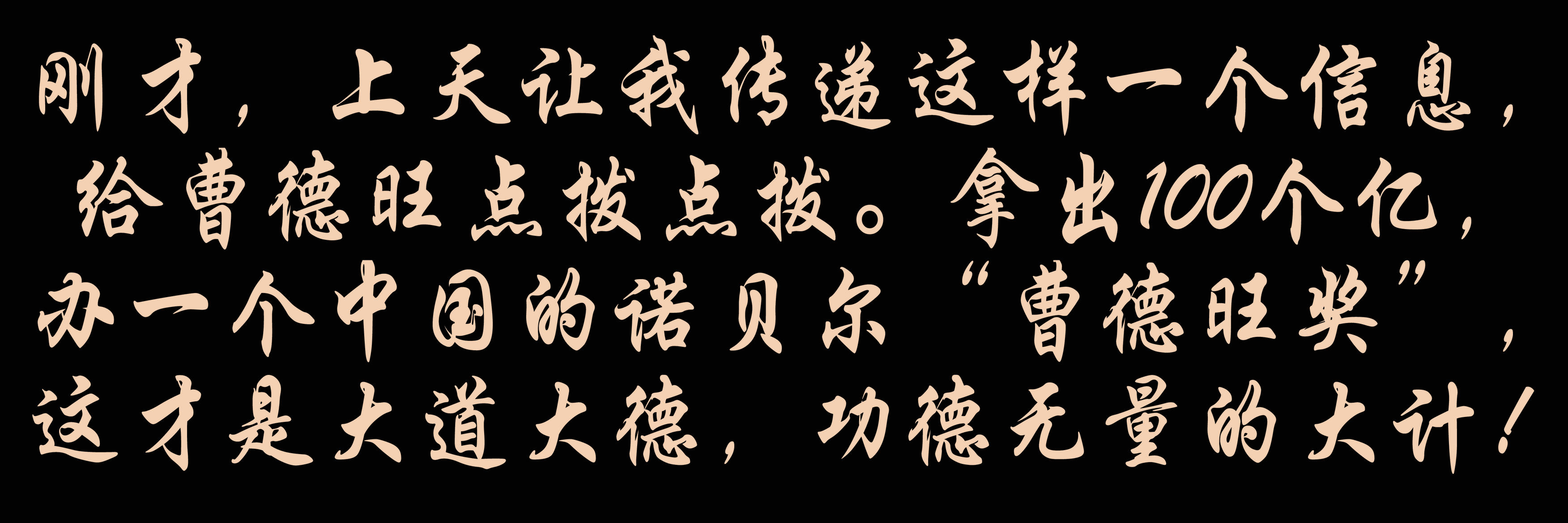 剛才,上天傳遞一個(gè)信息,給曹德旺先生點(diǎn)撥點(diǎn)撥。你愿意拿出100個(gè)億,辦一個(gè)“曹德旺獎(jiǎng)”,這才是人間正道是滄桑!
