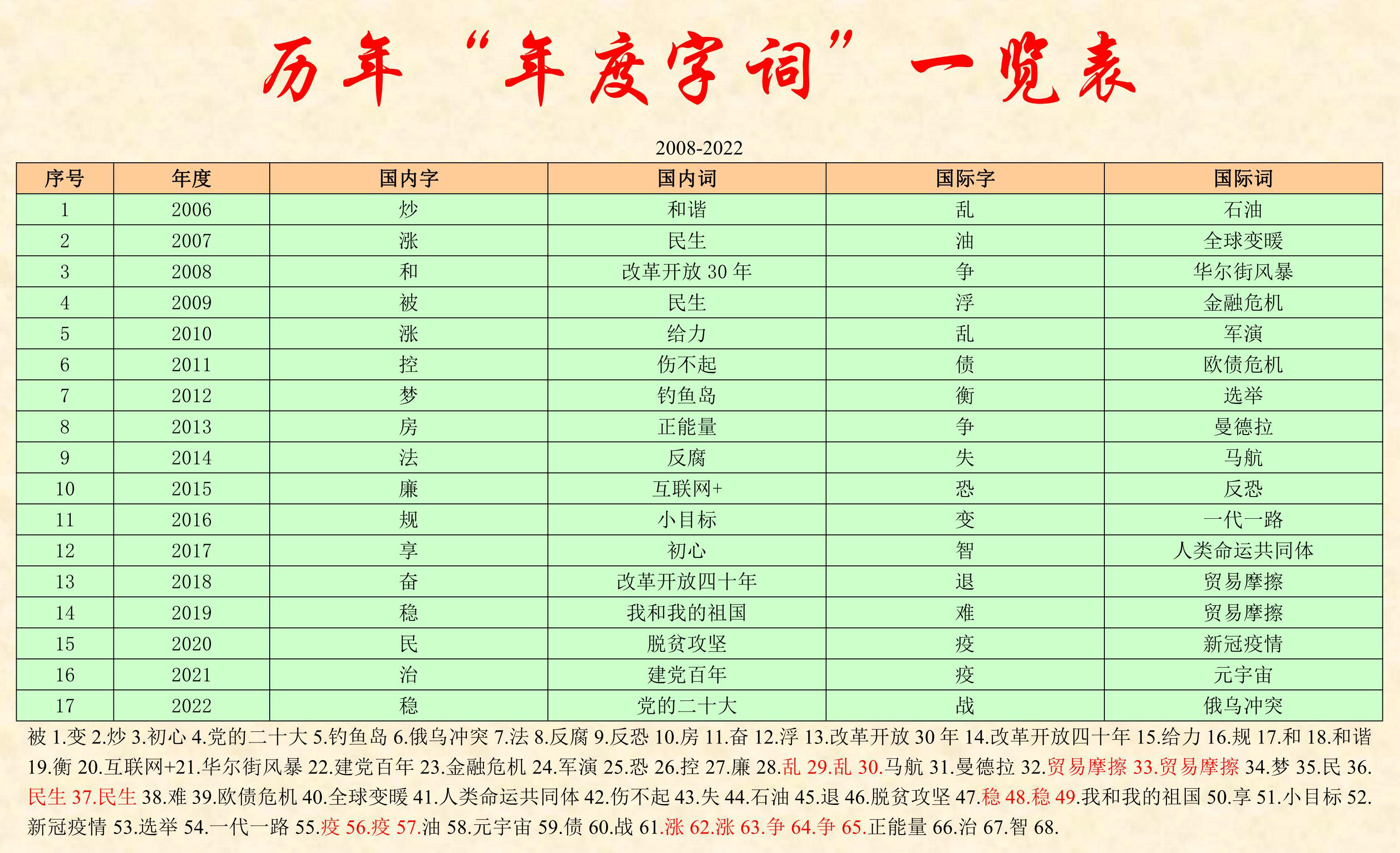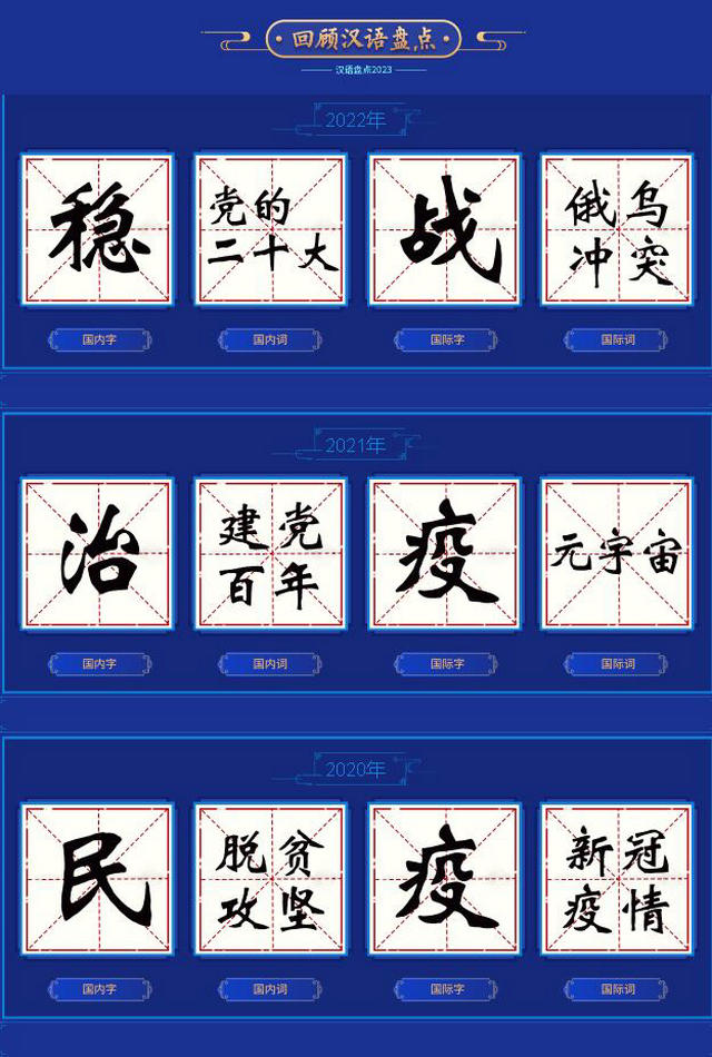 前五位年度國內候選字為“振”“智”“信”“新”“強”,前五位年度國內候選詞為“‘一帶一路’倡議十周年”“高質量發展”“煙火氣”“村BA”“特種兵式旅游”;前五位年度國際候選字為“危”“芯”“戰”“談”“核”,前五位年度國際候選詞為“戰爭”“ChatGPT”“核污染水”“芯片”“巴以沖突”。