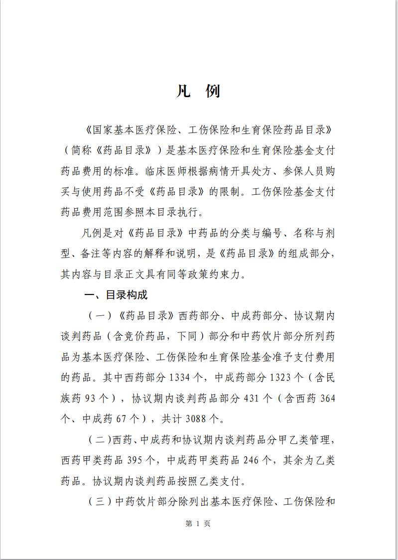 (一)《藥品目錄》西藥部分、中成藥部分、協(xié)議期內(nèi)談判藥品(含競價藥品,下同)部分和中藥飲片部分所列藥品為基本醫(yī)療保險、工傷保險和生育保險基金準予支付費用的藥品。其中西藥部分1334個,中成藥部分1323個(含民族藥93個),協(xié)議期內(nèi)談判藥品部分431個(含西藥364個、中成藥67個),共計3088個。