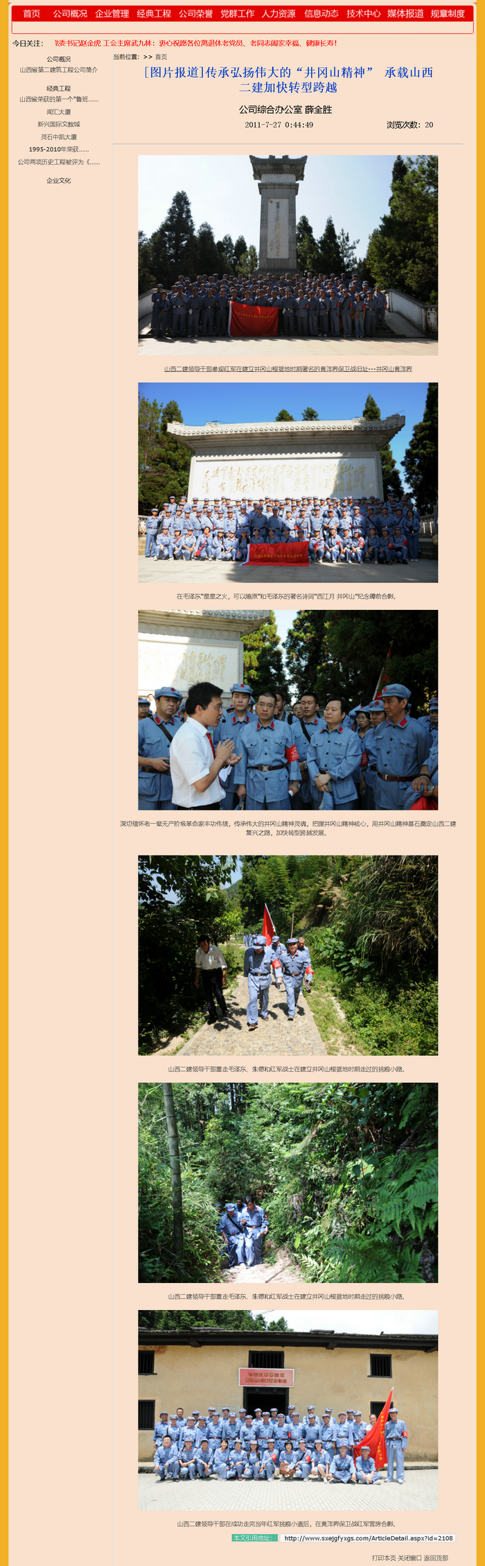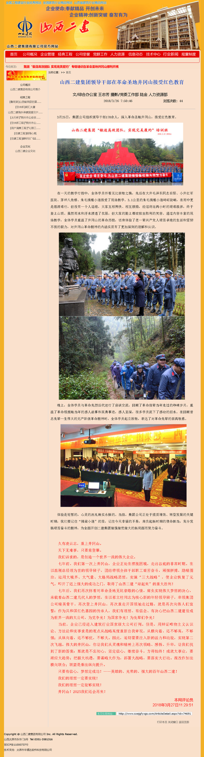 七年后,我們再次懷著對革命圣地無比崇敬的心情,肩負實現偉大夢想的決心,承載著山西二建幾代人的夢想,在以祁立柱同志為核心新的年輕領導班子,率領集團公司精英骨干,再次登上井岡山,再次重走開國領袖走過路,就是再次向偉人們宣誓:作為共和國紅色基因的傳承人,我們有理想、有信念、有決心把山西二建建設成為世界一流的大公司,為黨爭光!為國家爭光!為先輩們爭光!