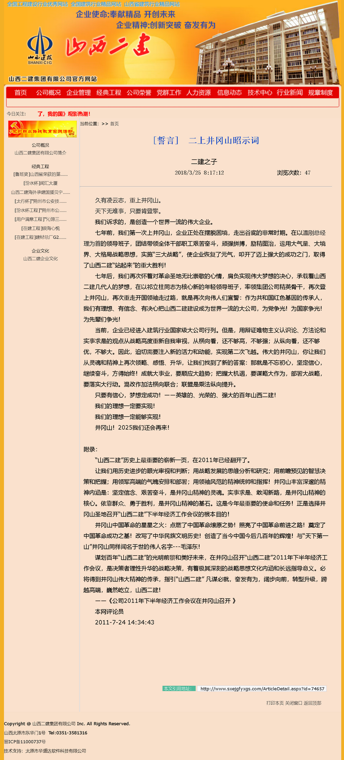 讓我們用歷史進步的眼光審視和判斷;用戰略發展的思維分析和研究;用前瞻預見的智慧決策和把握;用領軍高端的氣魄安排和部署;用領袖風范的精神統帥和指揮!井岡山豐富深邃的精神內涵是:堅定信念、艱苦奮斗,是井岡山精神的靈魂。實事求是、敢闖新路,是井岡山精神的核心。依靠群眾、勇于勝利,是井岡山精神的基石。這是今年最重要的使命和任務!正是選擇井岡山圣地召開“山西二建”下半年經濟工作會議的根本目的!