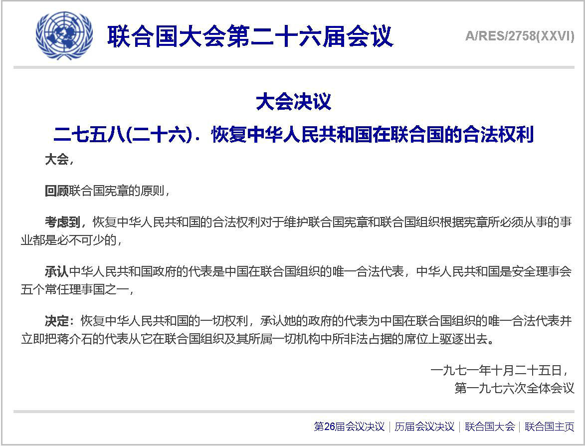 決定:恢復(fù)中華人民共和國的一切權(quán)利,承認(rèn)她的政府的代表為中國在聯(lián)合國組織的唯一合法代表并立即把蔣介石的代表從它在聯(lián)合國組織及其所屬一切機(jī)構(gòu)中所非法占據(jù)的席位上驅(qū)逐出去。