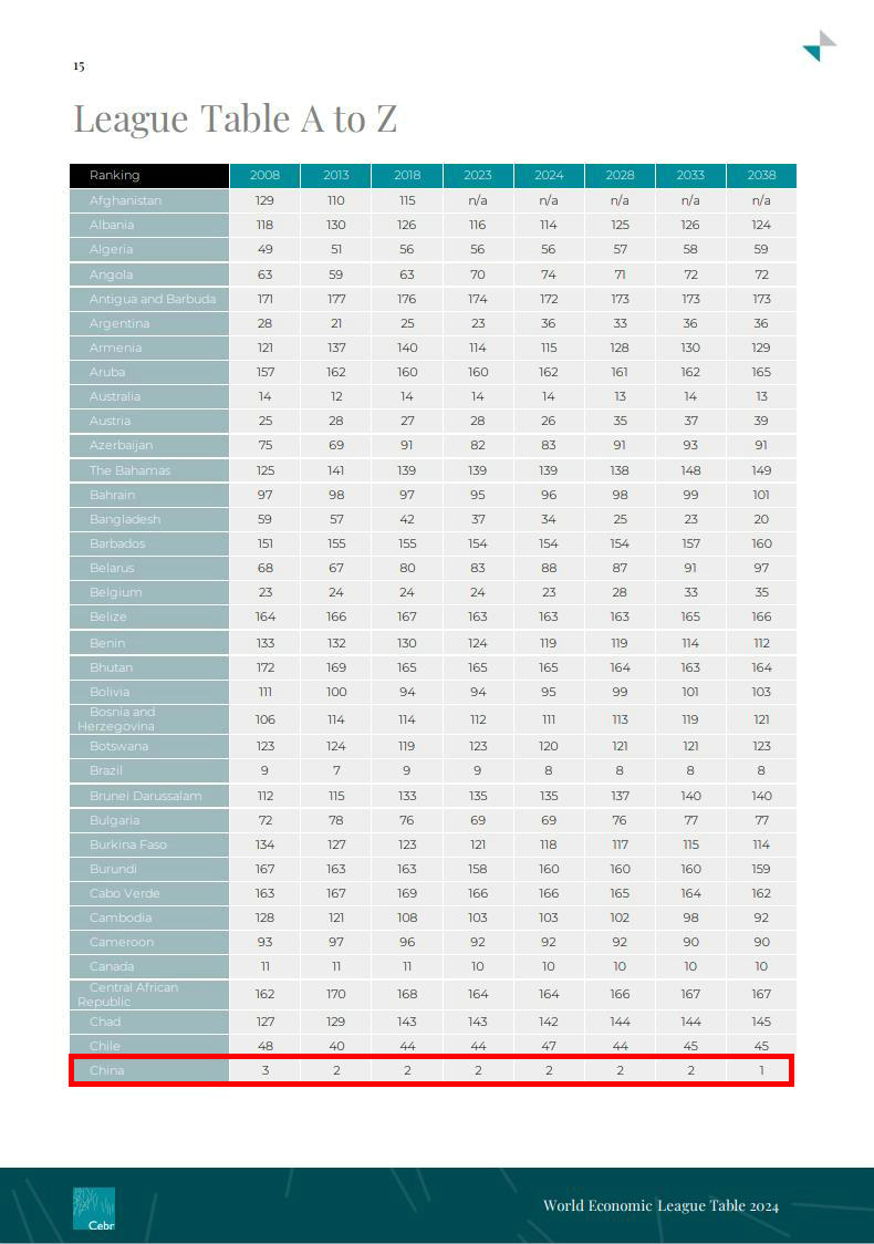 CEBR還預測,到2038年,意大利將跌出全球前十大經濟體,被韓國取代。美國和德國的排名將下滑,印度和巴西這兩個人口眾多的發(fā)展中經濟體排名將上升,躋身前十大經濟體之列。