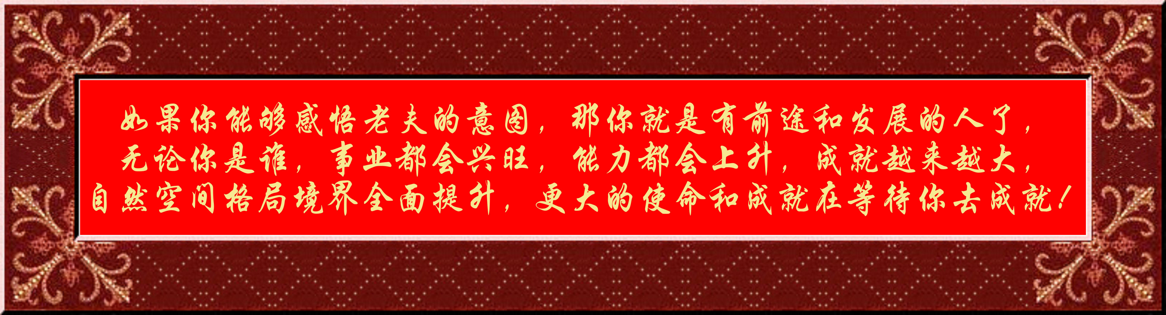 如果你能夠感悟老夫的意圖,那你就是有前途和發(fā)展的人了,無論你是誰,事業(yè)都會(huì)興旺,能力都會(huì)上升,成就越來越大,自然空間格局境界全面提升,更大的使命和成就在等待你去成就!