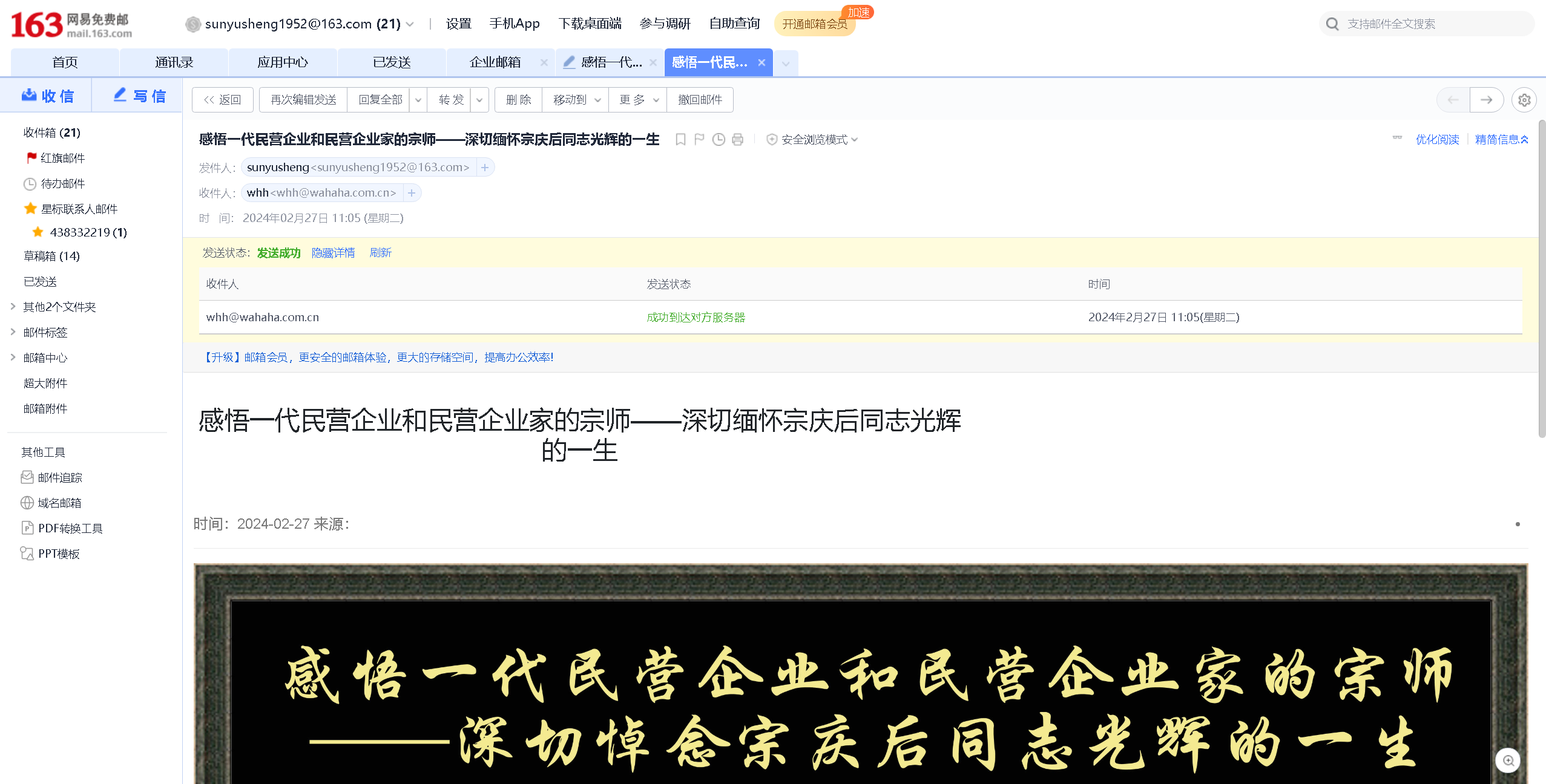 我們懷念宗老,就是要以他為榜樣,把人生事業(yè)境界提升到更大的空間,以頑強(qiáng)的意志和信心,創(chuàng)造世界一流大企業(yè)!