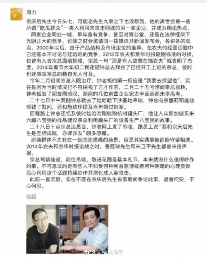 另據(jù)國(guó)是直通車3日?qǐng)?bào)道,農(nóng)夫山泉副總周力博士朋友圈文,回應(yīng)“捧‘娃哈哈’踩‘農(nóng)夫山泉’風(fēng)波”。周力表示,宗慶后先生今日頭七,可能老先生九泉之下也沒想到,他的離世會(huì)被一些所謂“吃瓜群眾”一類人利用來攻擊同城的另一家企業(yè),并成為輿論熱點(diǎn)。兩家企業(yè)同處一城,早年雖有競(jìng)爭(zhēng),甚至對(duì)薄公堂,還是在法律框架下光明正大的競(jìng)爭(zhēng)。