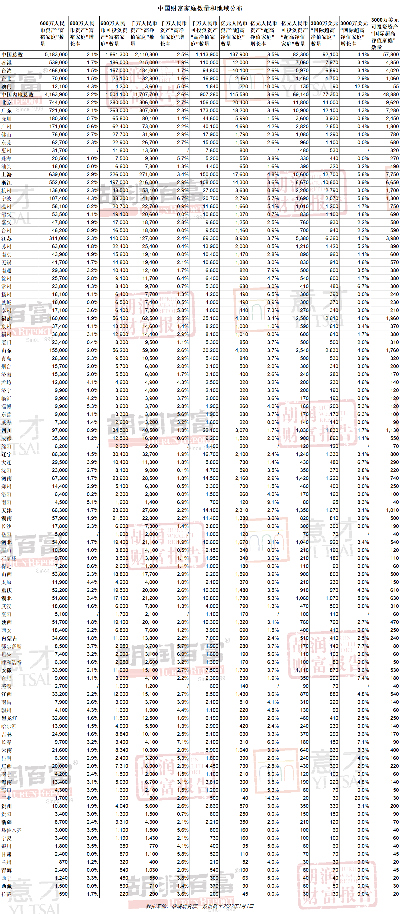 胡潤研究院今日發布《2023胡潤財富報告》(Hurun Wealth Report 2023)。報告揭示了目前中國財富家庭數量、地域分布情況以及人群畫像。這是胡潤研究院連續第15年發布《胡潤財富報告》。報告除了公布中國擁有600萬人民幣、千萬人民幣、億元人民幣和3000萬美元總財富的家庭數量之外,也公布了擁有600萬人民幣、千萬人民幣、億元人民幣和3000萬美元可投資資產的家庭數量。