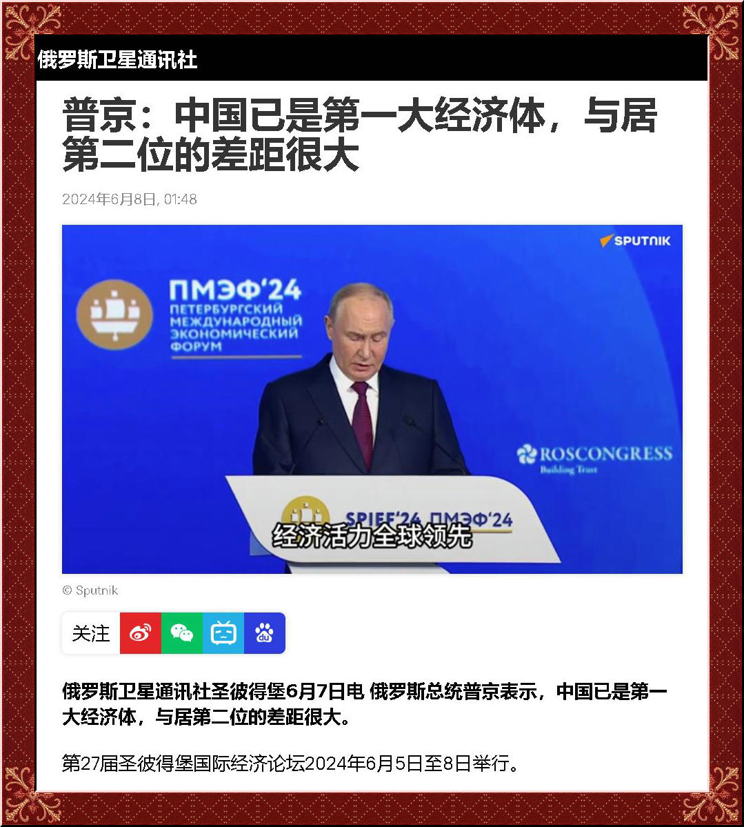 【學習園地】普京:中國已是第一大經濟體,與居第二位的差距很大