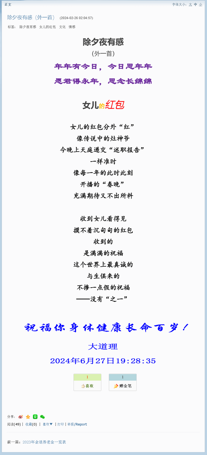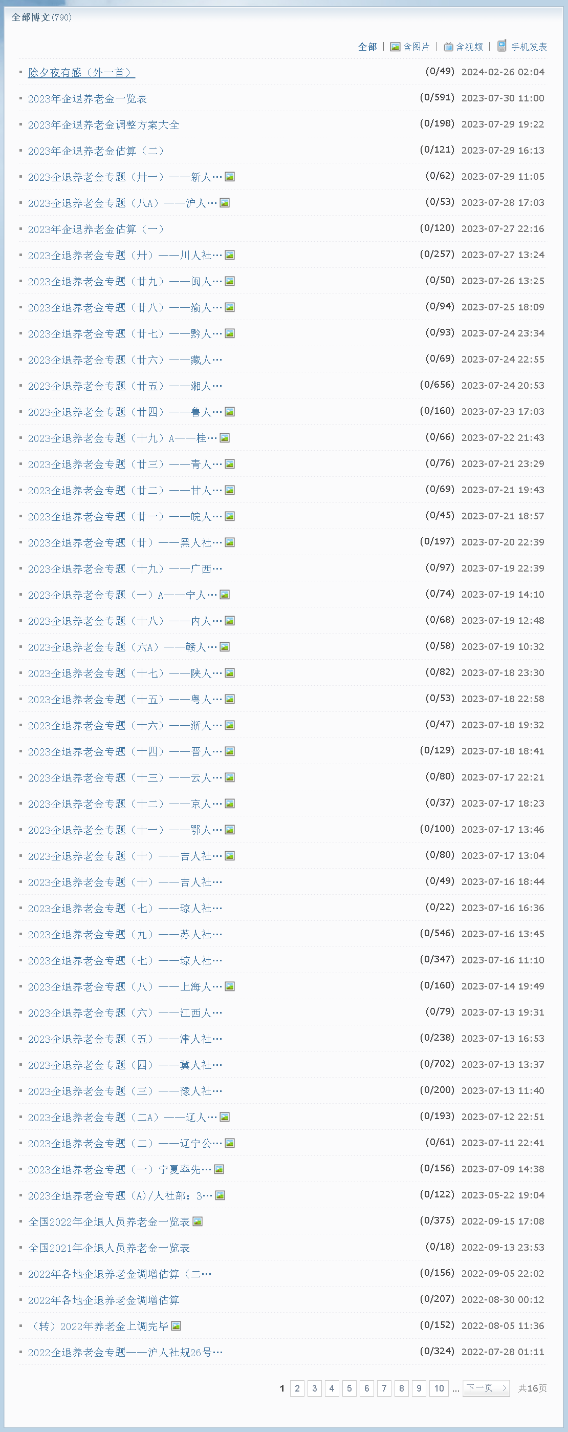 今年國(guó)家發(fā)布二十連漲政策,我看他的博客沒(méi)有更新。山東省第一家公布2024年退休人員養(yǎng)老金上調(diào),水曰北流泉博客依然如故。