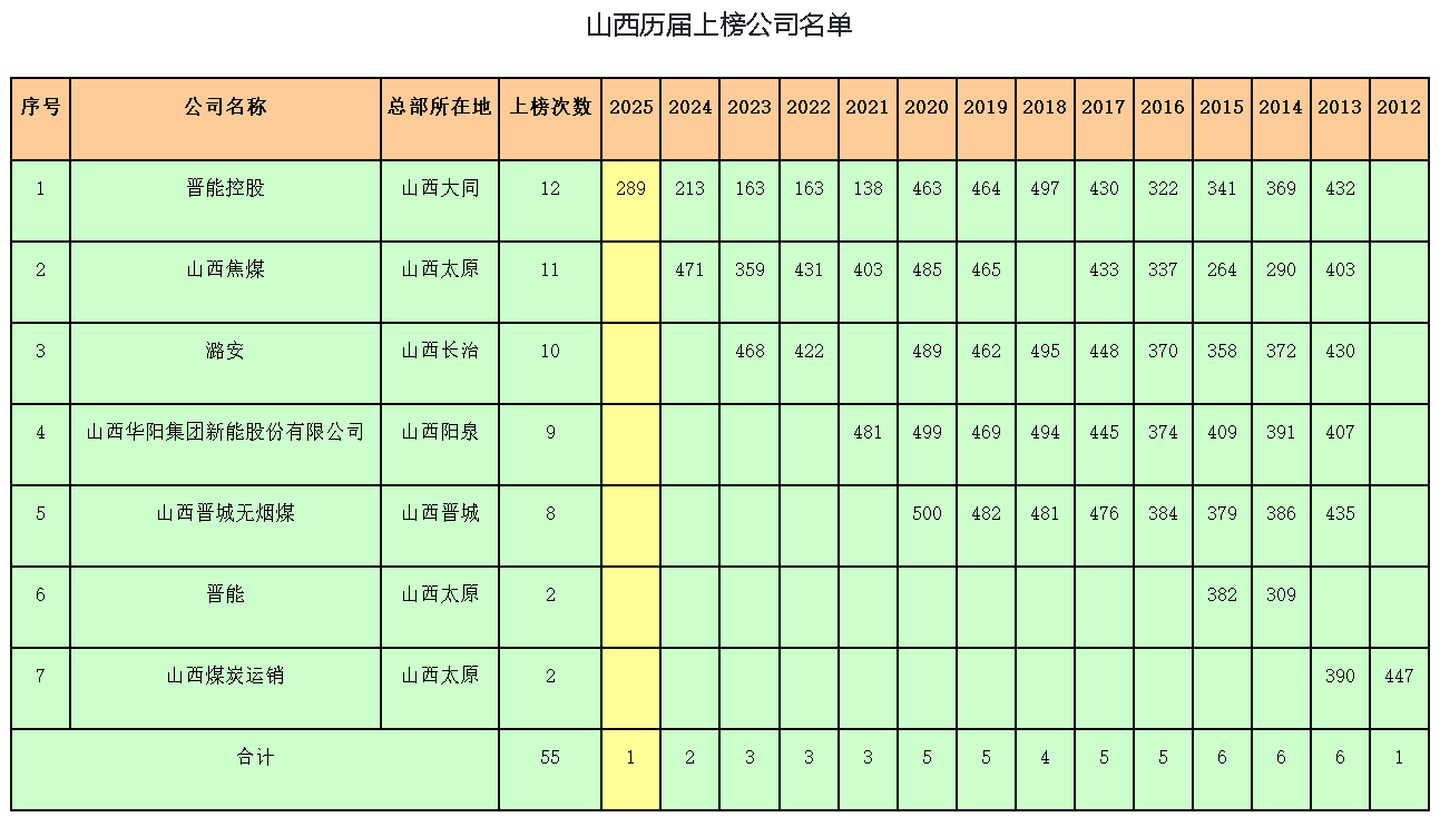 以下為山西資本圈整理的自2013年至今入圍世界500強(qiáng)的晉企名單及排名情況: