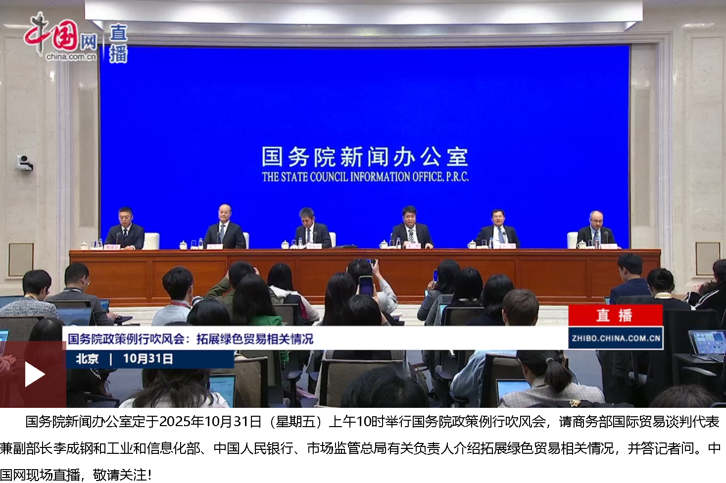 女士們、先生們,大家上午好!歡迎出席國務院政策例行吹風會。昨天《關于拓展綠色貿易的實施意見》已經公開發布。為幫助大家更好地了解相關情況,今天我們邀請到商務部國際貿易談判代表兼副部長李成鋼先生,請他為大家介紹《實施意見》有關情況,并回答大家的問題。出席今天吹風會的還有:工業和信息化部節能與綜合利用司司長王鵬先生、商務部對外貿易司司長王志華先生、中國人民銀行研究局局長王信先生,市場監管總局計量司司長國煥新先生。