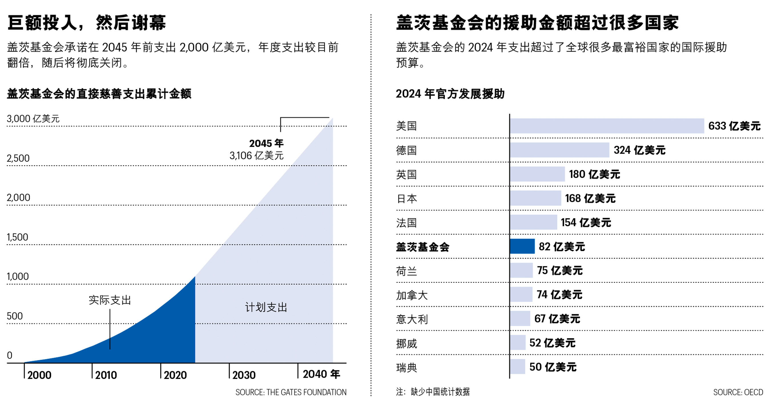 對于如此規模的基金會而言,規定期限相當罕見。舉例來說,約翰·D·洛克菲勒(John D. Rockefeller)和安德魯·卡內基(Andrew Carnegie)創立的基金會歷經百年仍在運作。蓋茨基金會成立的頭25年的支出剛剛超過1,000億美元,未來20年每年將投入大約100億美元,總支出超過了除最富裕國家之外的所有國家的全部對外援助預算。