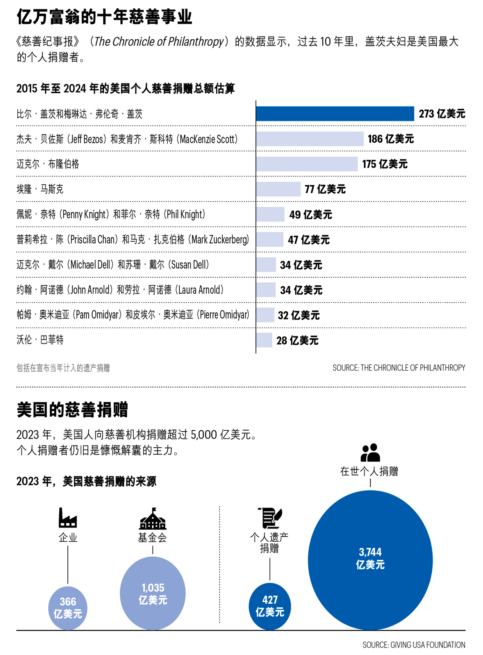 最后的成果是“捐贈誓言”(Giving Pledge),承諾在生前或去世后捐出至少一半財富。“我們起初希望可以找到50位到80位志同道合的慈善人士。”蓋茨說。截至2024年7月,已經有244人加入。簽署者包括商業界和不同意識形態領域的知名人士,比如對沖基金經理比爾·阿克曼(Bill Ackman)、商界領袖兼政治家邁克爾·布隆伯格(Michael Bloomberg)以及LinkedIn的創始人里德·霍夫曼(Reid Hoffman)。