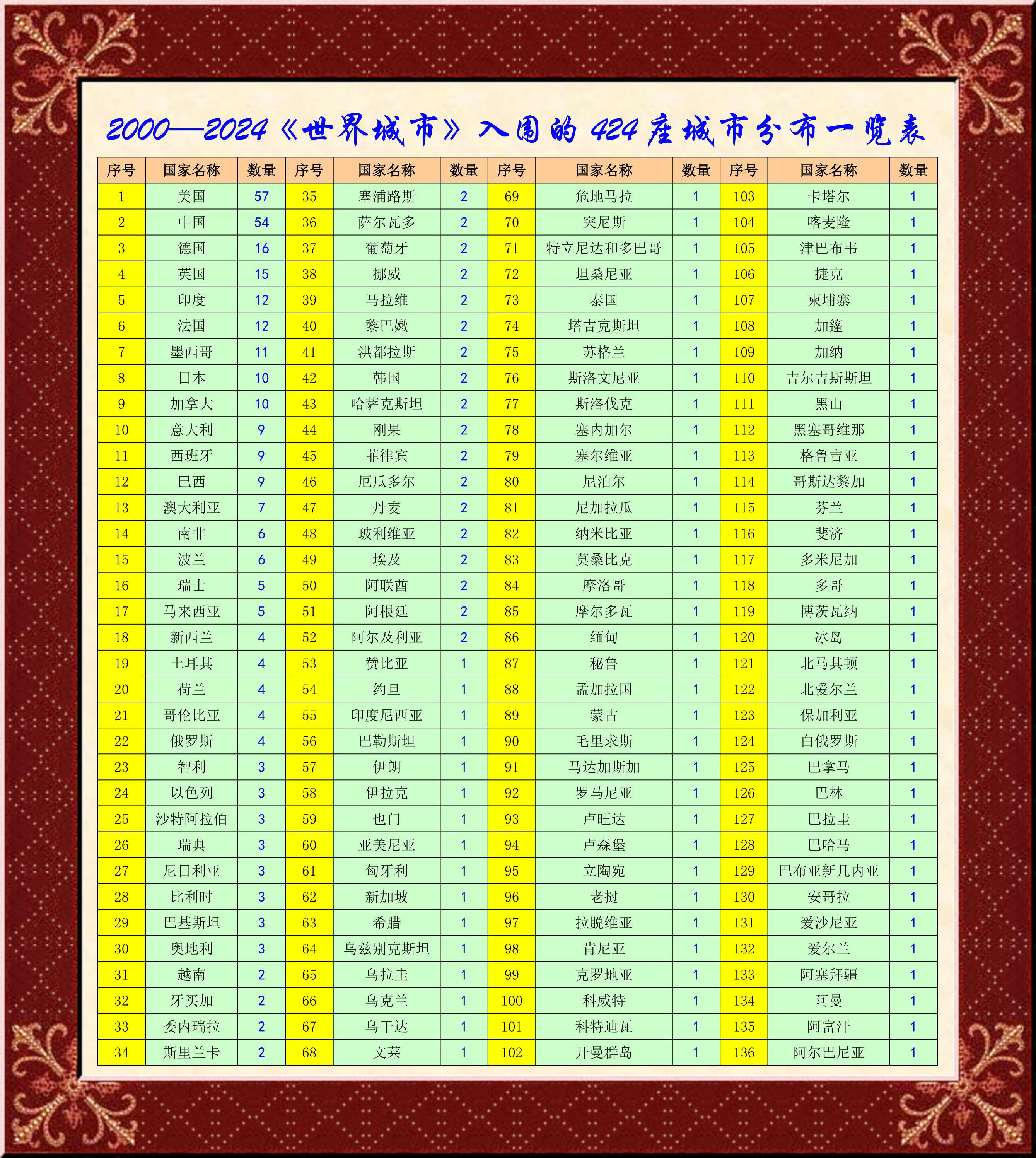 于是,再翻騰出來,一個城市一個城市查閱所在地(所屬國),添加到統計表中。有了這個資料,編輯分布一覽表那就易如反掌,可以清清楚楚看明白我們在哪個區段是什么維度!美國第一57個城市,中國第二54個城市,相差無幾不分伯仲!